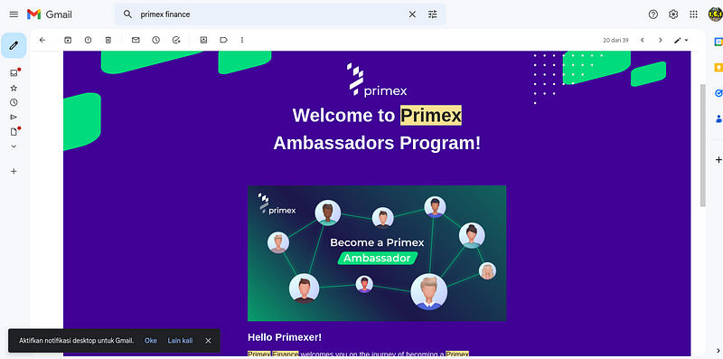 Isi email tersebut adalah petunjuk mengenai apa yang harus saya lakukan selanjutnya. Setelah membaca petunjuk ternyata Primex Finance memiliki tingkatan atau ranking untuk program ini. Email ini menandakan bahwa saya resmi menjadi “ambasador magang”.