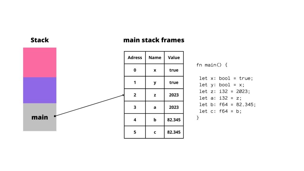 Pada kode di atas mekanisme yang terjadi pada memori berbeda dengan contoh sebelumnya. Hal ini dikarenakan U32/Un, F32/Fn, boolean, char, dan tuples berada dalam stack. Rust memiliki anotasi copy sehingga tidak diperlukan duplikasi data seperti heap.