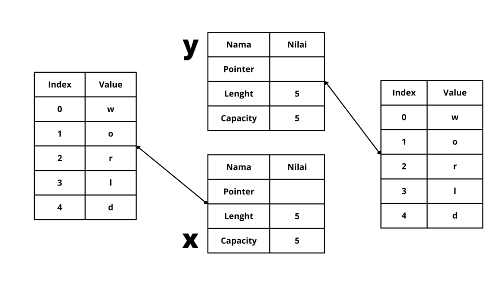 Berdasarkan tabel tersebut dapat diketahui” bahwa variabel x disandingkan dengan String, yaitu “Word“. Secara eksplisit berarti String disimpan pada variabel x kemudian dikopi untuk variabel y.