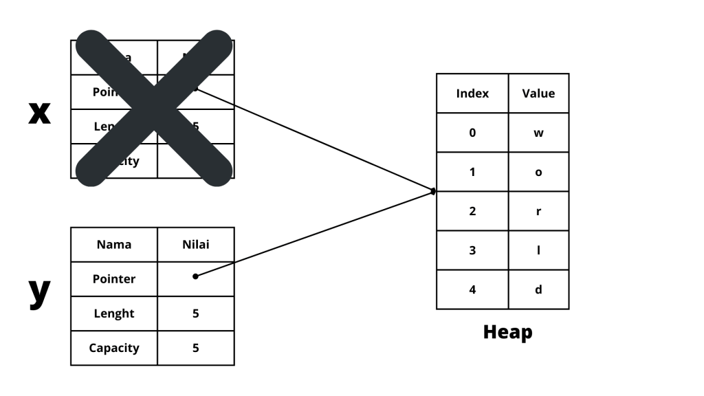 Untuk mengatasi masalah tersebut rust menjadikan variabel x invalid sehingga kita tidak bisa memanggil atau menggunakan variabel x setelah variabel y dideklarasikan. Dengan demikian pada saat variabel y sudah berada di luar jangkauan pembersihan memori hanya dilakukan satu kali saja.