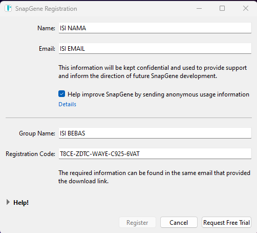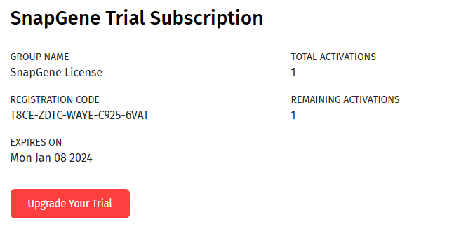 Snapgene adalah tools yang berhubungan dengan biologi molekuler seperti mendeteksi kesalahan dalam prosedur kloning, mendesain konstruksi DNA secara akurat sampai menampilkan konstruksi DNA dalam skema visual yang mudah dimengerti. Software ini berbasis subscription tetapi kita dapat memanfaatkan trial selama 30 hari.