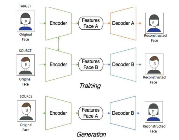 - Decoding: Setelah fitur-fitur wajah atau suara dikodekan, model kemudian menggunakan pemetaan yang telah dipelajari untuk menghasilkan gambar atau suara. Misalnya wajah sumber akan “dipasangkan” dengan video target, sehingga menciptakan ilusi bahwa orang dalam video target adalah orang yang dienkripsi.