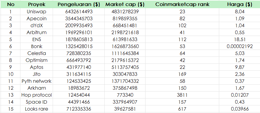 Pengeluaran untuk airdrop berkorelasi dengan marketcap dan harga, maka ketika pengeluaran untuk airdrop semakin besar, harga dan marketcapnya juga semakin tinggi.