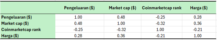 Berdasarkan tabel 1.1 dapat diketahui bahwasannya harga suatu token tidak dipengaruhi oleh coinmarketcap rank, korelasinya negatif. Sehingga untuk 15 proyek yang dianalisis, semakin tinggi ranking coinmarketcap maka harganya akan semakin rendah.