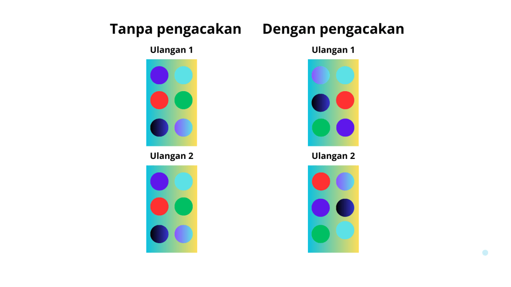 Beda cerita kalau diacak, tanaman di ulangan kedua menempati tanah yang lebih subur, sampai sini bisa kita simpulin bahwa pengacakan itu salah satu cara supaya tiap perlakuan kita dapat kesempatan yang sama.