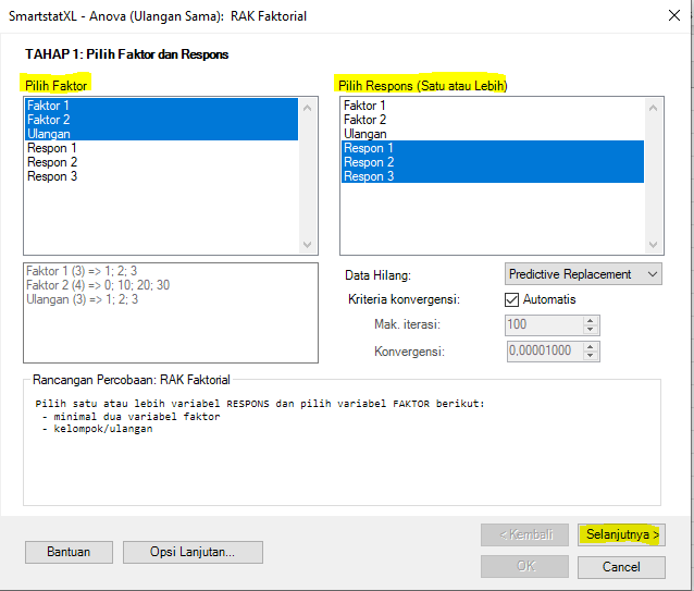 5. Pilih faktor dan respons yang sesuai dengan data milik anda. Setelah itu klik “Selanjutnya”.