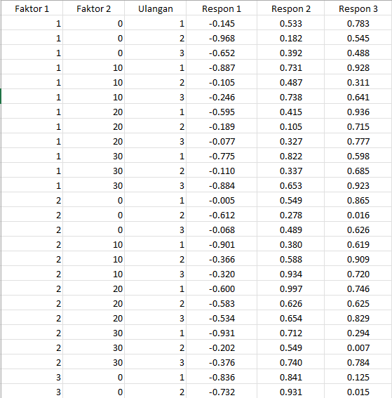 Misalnya faktor 1 adalah jenis olah tanah dengan keterangan dicangkul(1), traktor (2), dan 3 (tanpa olah tanah). Faktor 2 adalah pupuk organik 10 kg, 20 kg, dan 30 kg. Respon adalah variabel pengamatan pada penelitian.