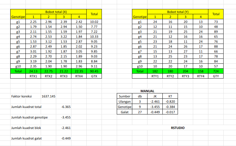 Pengolahan data manual menggunakan excel saya sarankan dilakukan bagi anda yang berada di bidang pemuliaan tanaman sebagai bentuk konfirmasi. Cara perhitungan manual ini penting dan silahkan baca buku Analisis Rancangan Dalam Pemuliaan Tanaman: Penerapan Statistika dalam Penelitian Pemuliaan Tanaman (Repo Unand) karya P.K. Dewi Hayati.