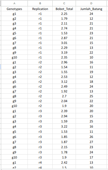 - olah_data$Genotypes,olah_data$Replication menunjukan kolom Genotypes dan Replications. Perhatikan huruf awal dari kolom karena harus sama dengan yang ada pada datasheet.