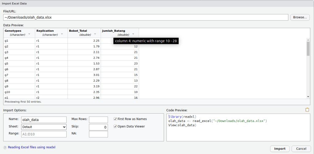 6. Perhatikan jenis data, genotipe (character), replikasi (character), Bobot_total (double), dan Jumlah_Batang (double). Ceklis “First row as Names” karena kolom tabel kita memiliki nama. Bagian ini penting karena jika salah dapat mengakibatkan kegagalan analisis.