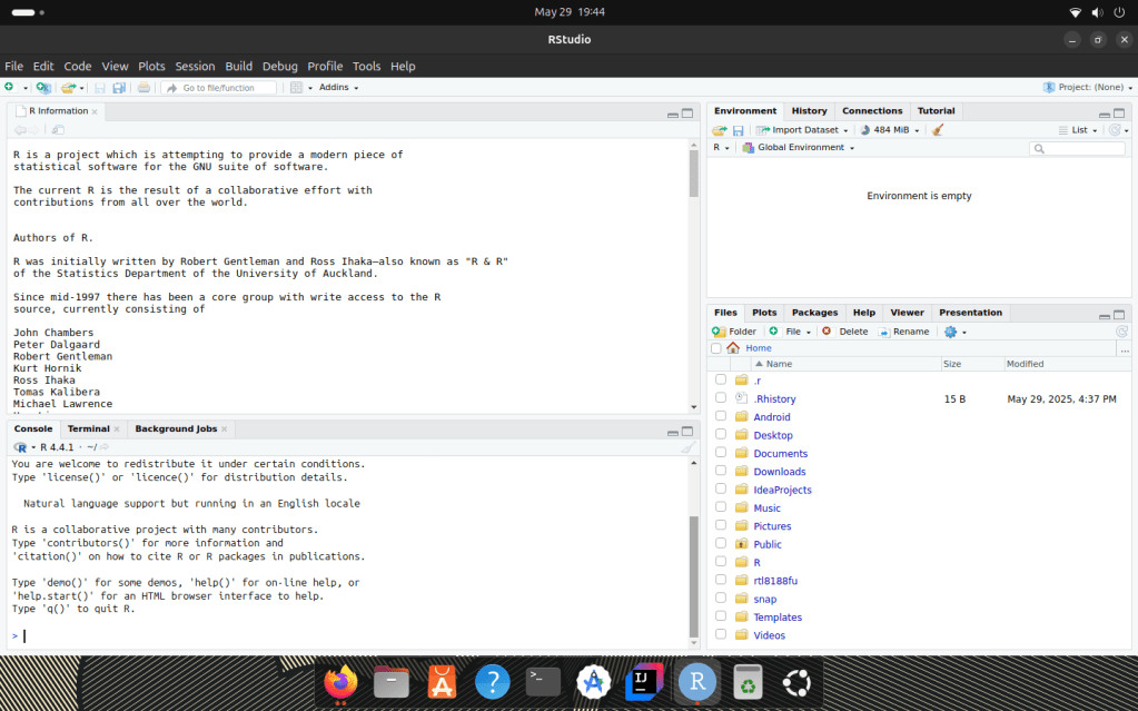 - Buka RStudio, tampilan awal aplikasi akan seperti di bawah ini: