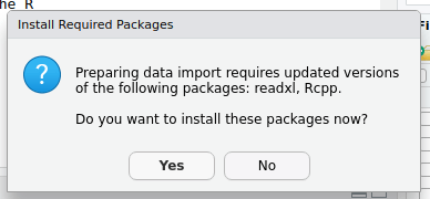 3. Import data menggunakan format .xlsx membutuhkan instalasi plugin tambahan, yaitu readxl dan Rccp. Pilih “yes” pada notifikasi ini dan tunggu sampai proses instalasi selesai.