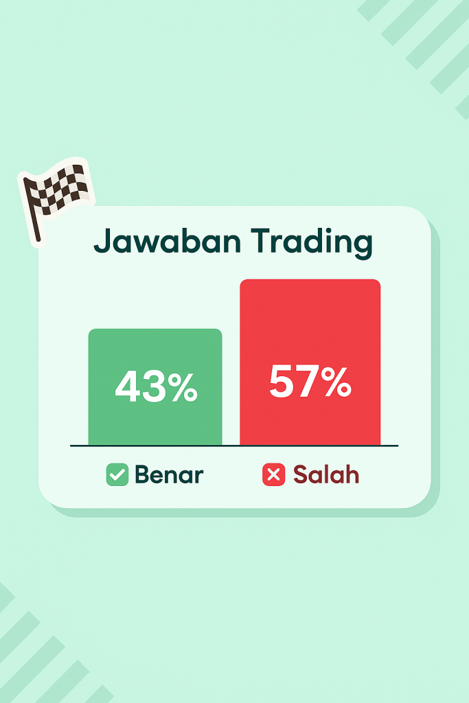 Persentase pada Gambar 2. adalah hasil trading penulis dengan total 84 order buy/sell dilakukan. Hasilnya seperti pada eksperimen pertama bahwa menjawab dengan salah lebih mudah, dibuktikan dari persentase salah > benar.