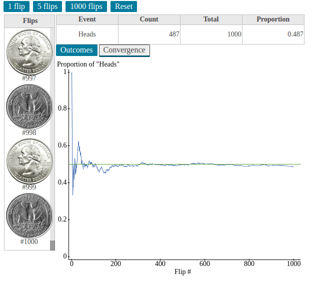 Hasilnya menunjukkan bahwa semakin banyak percobaan yang dilakukan, nantinya akan mendekati peluang dasar 50:50. Pada lemparan ke-1 sampai 200 terjadi fluktuasi dimana proporsi dari gambar >60%.
